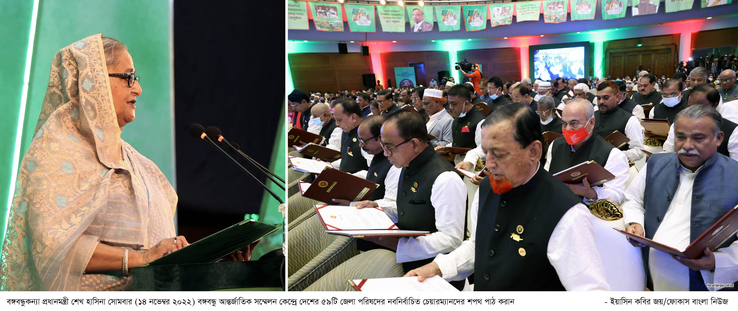 জেলা পরিষদের ৫৯ জন চেয়ারম্যানসহ নবনির্বাচিত প্রতিনিধিদের শপথ বাক্য পাঠ করালেন প্রধানমন্ত্রী শেখ হাসিনা। আজ সোমবার রাজধানীর বঙ্গবন্ধু আন্তর্জাতিক কনভেনশন সেন্টারে (বিআইসিসি) এ শপথ অনুষ্ঠিত হয়।