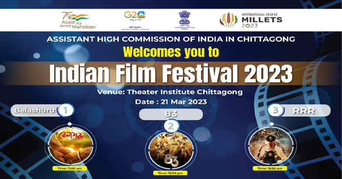 ভারতীয় হাই কমিশন চট্টগ্রামের উদ্যোগে কাল ২১ মার্চ ইন্ডিয়ান ফিল্ম ফেস্টিভ্যালের ২০২৩ আয়োজন করা হয়েছে। এ উপলক্ষে নগরের থিয়েটার ইনস্টিউটটে তিনটি সিনেমা দেখানো হবে। সিনেমা তিনটা হলো বেলাশুরু, এইটিথ্রি, ও আরআরআর।