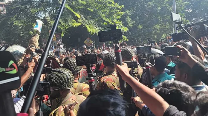রাজধানীর ধানমন্ডি ৩২ নম্বরের সামনের মিরপুর সড়কে দুটি বুলডোজার নিয়ে প্রবেশের চেষ্টা করে একদল তরুণ। এ সময় তাদের বাধা দেয় আইনশৃঙ্খলা রক্ষাকারী বাহিনী। পরিস্থিতি নিয়ন্ত্রণে আনতে লাঠিপেটাও করা হয়।